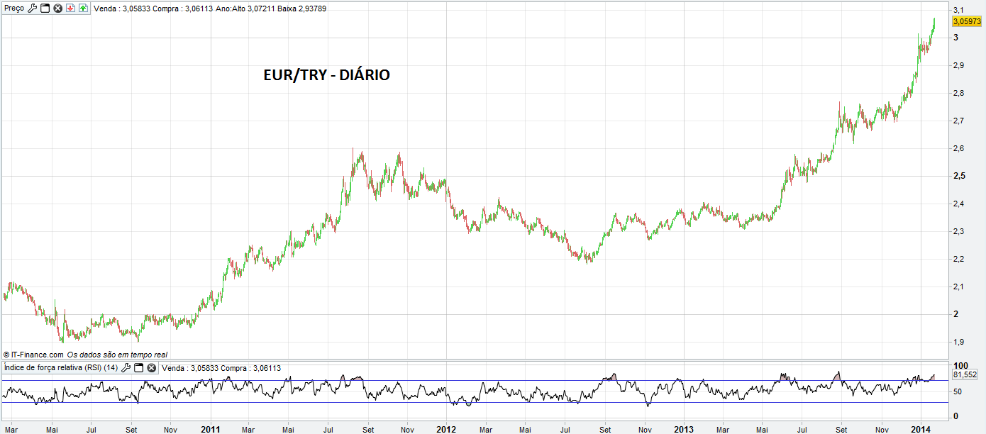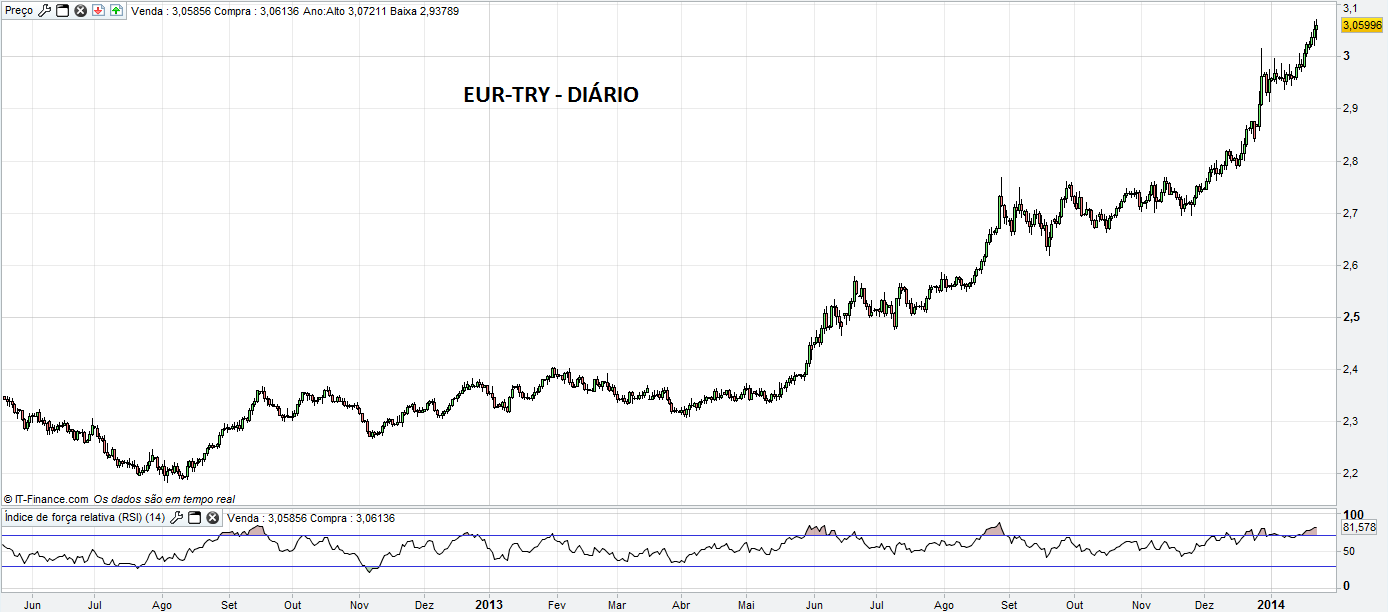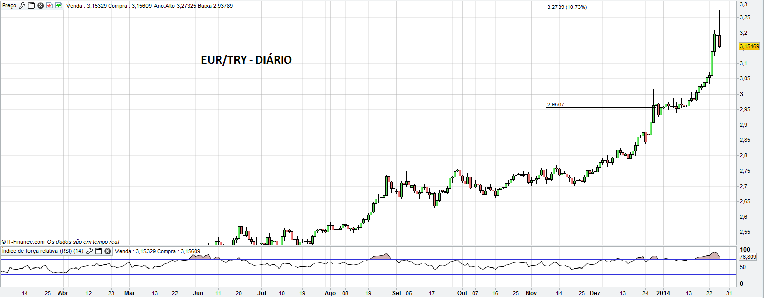 Bem, hoje a moeda turca já levava outra esticada de desvalorização diária como tem vindo a ser costume, quando estava a desvalorizar mais de 2,5% para a maioria das moedas eis que o Banco Central da Turquia lança um comunicado de uma reunião especial/emergência para amanhã com o principal objetivo de ser discutidas as medidas a tomar para estabilizar a lira turca, especula-se que haja um bom aumento das taxas de juro, este comunicado fez com que a lira recuperasse das perdas estando neste momento a valorizar entre os 0,5% e 1%.