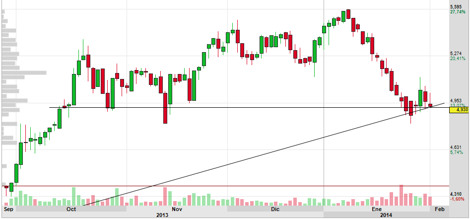 Parece-me estar com um potencial de valorização no C/P de cerca de 12% e a tendência descendente que se iniciou em 08/01 parece estar ultrapassada. Tem estado com um volume aceitável e o padrão dos candles, parece ser favorável à confirmação da reversão da tendência de baixa para a tendência de alta. O MACD também me parece estar favorável e o RSI a entrar numa zona favorável e a acusar alguma sobrevenda.. Parece-me que se aguentou bem no suporte ali na zona dos 4.85/4.87, e que agora tem tudo para subir até a zona dos 5.60.
