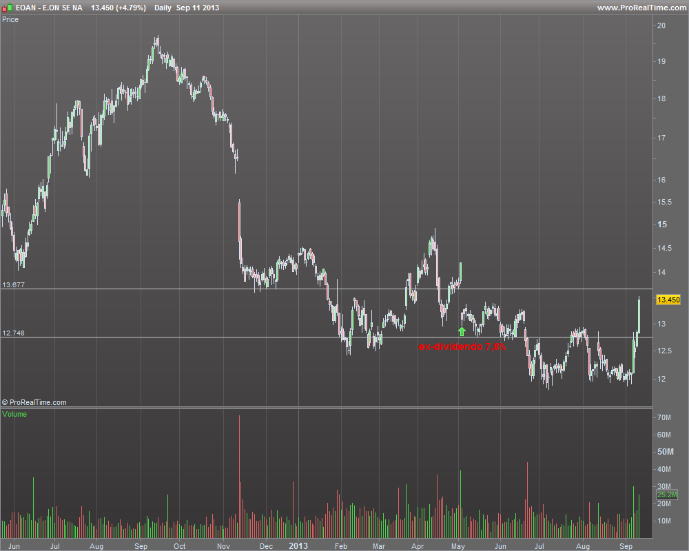 Essa sessão também me chamou a atenção, apesar de ser um título que já venho a acompanhar há algum tempo. Note-se que a valores corrigidos do dividendo (brutal) que distribuíram em Maio, a sessão teria fechado mesmo em cima da resistência dos ~13,7 e os últimos dois meses teriam sido passados acima do suporte nos ~12,7. Julgo que um gráfico corrigido neste título em particular daria a impressão de se estar a desenhar um fundo com um ano - mas a minha opinião em relação a gráficos corrigidos é suspeita - ainda assim no PRT continua por corrigir... acho que tenho mesmo que lhes mandar um e-mail.