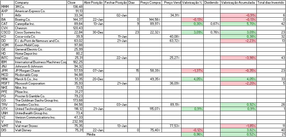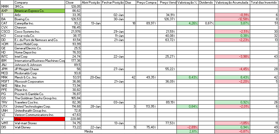 - Venda: American Express Co. e Boeing Co., que neste momento apresenta uma desvalorização de mais de 10%