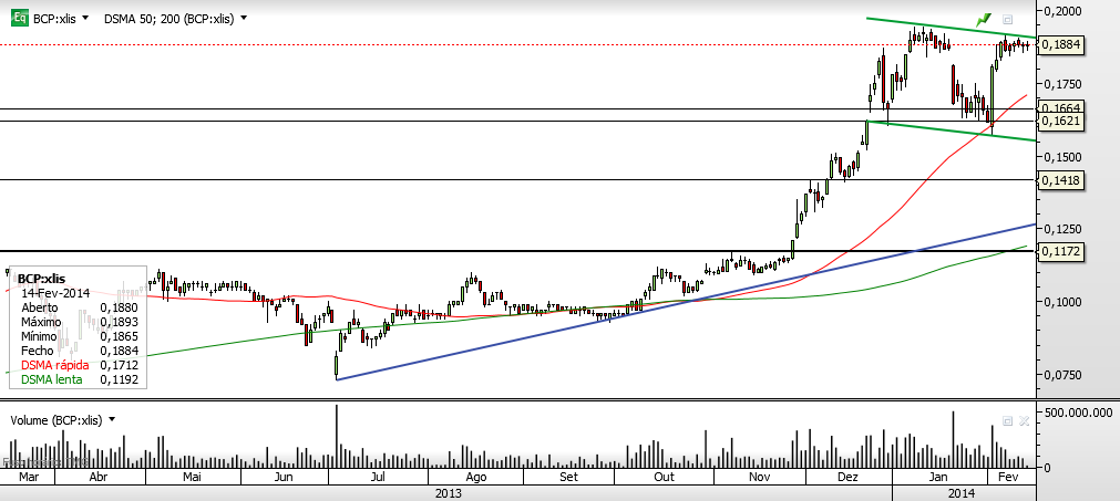 Vejo o BCP sem força para quebrar a resistência em torno da zona dos 0.19.