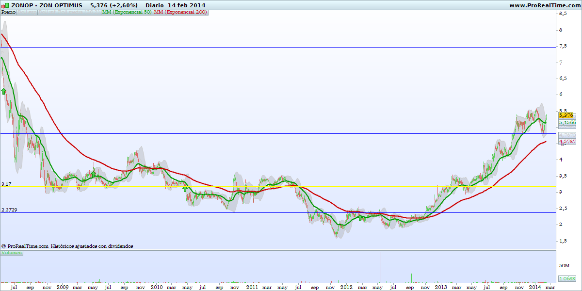 Técnicamente, depois de em 2009-2011 ter vivido bons momentos, acabou por cair até fevereiro 2013 quando fez o mínimo. Depois criou ali uma resistência na casa dos 5.30 usd que foi quebrada em julho 2013 com bons volumes colocando-se a cotação acima da mm200. Em seguida fez pullback ao suporte (anterior resistência) e volta a subir de novo com volume. Nos dias seguintes ocorre a golden cross. Agora anda alí na luta numa zona de resistência na casa dos 6.50 que já fora suporte e resistência em 2012.