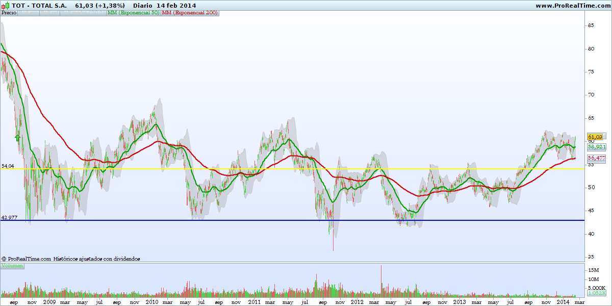 Entrei na TOT também em 2008, e mantenho a mesma posição até agora. Sinceramente recordo-me que entrei na altura com base em 2 ou 3 indicadores que tinha visto nuns testes no prorealtime, mas não me recordo quais. Santa ignorância... fui comprar um ADR na américa de uma cotada europeia quando podia ir diretamente ao CAC aqui na europa. O que vale é que foram distribuindo dividendos generosos. Em baixo está o gráfico do negócio, mas estes gráficos de ADR's estão cheios de gap's devido ao efeito eur/usd, pelo que me vou guiando sobretudo pelas analises que faço usando o gráfico do CAC – FP. Analisando o mesmo vemos uma boa evolução da cotada desde que rompeu uma importantissima resistência na casa dos 38,35, com os preços acima da mm200, tem agora pela frente mais uma importante resistência na casa dos 44,70. Dada a conjuntura vou-me manter dentro também.