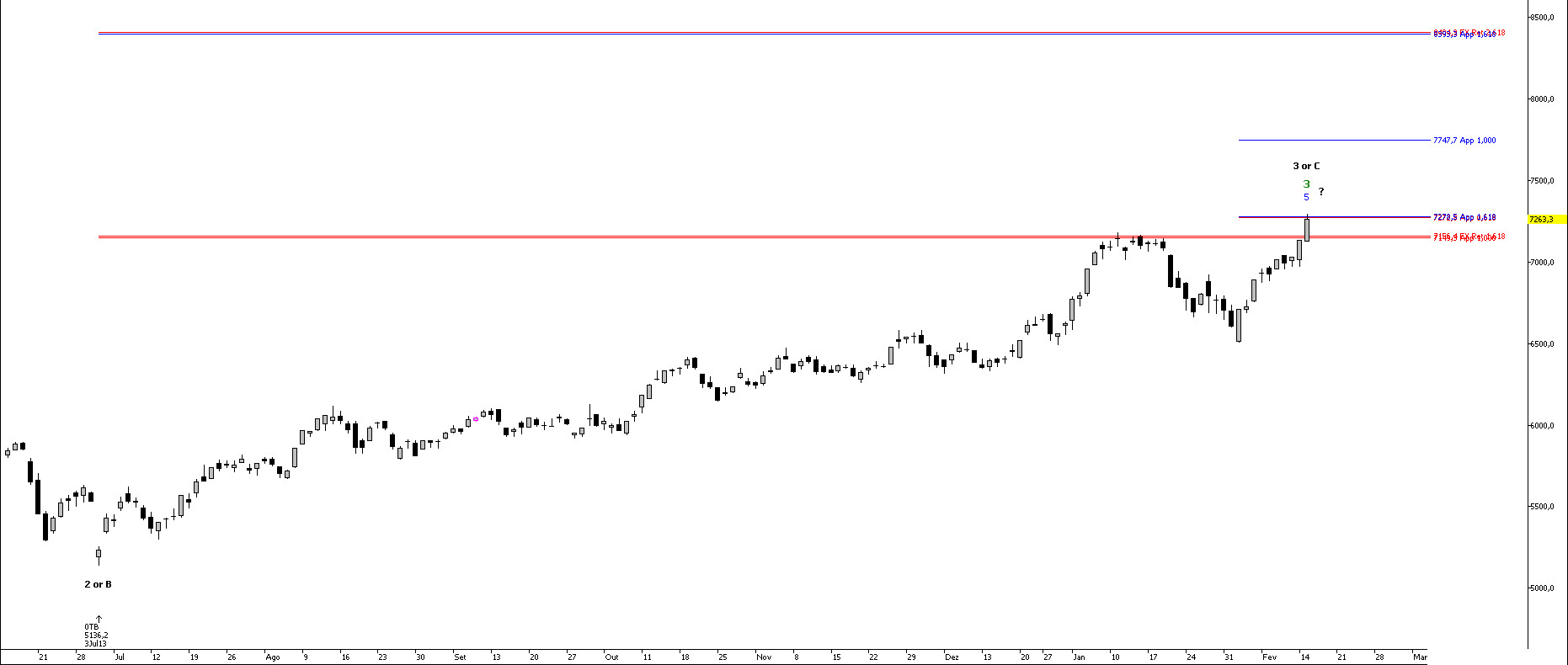 Correndo o risco de algum simplismo (mas não esquecendo os ensinamentos de Ockham sobre as virtudes das hipóteses mais simples...), a onda 3 fará aproximadamente 1,618 da onda 1, cerca de 3250 pontos, ou seja, terminará na zona dos 8400.
