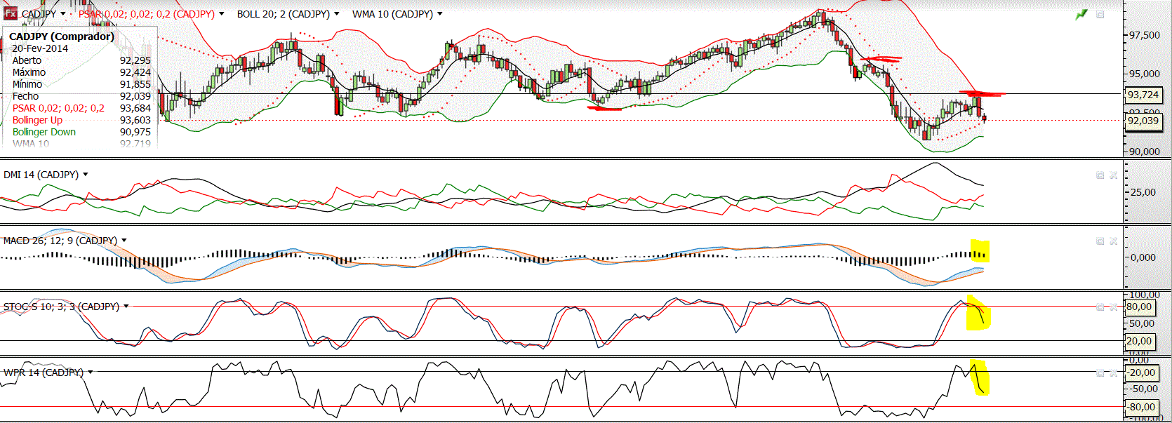 - 1 - Indice tem vindo a lateralizar com alguma amplitude; 2 - Desde o início deste ano o rumo parece ser para sul, até porque foram quebrados em baixa suportes relevantes e o par tem vindo a fazer máximos e mínimos mais baixos; 3 - MACD começou a descer; 4 - Indicadores oscilatórios parecem apontar para uma inversão da tendência de curto prazo de longo para curto;