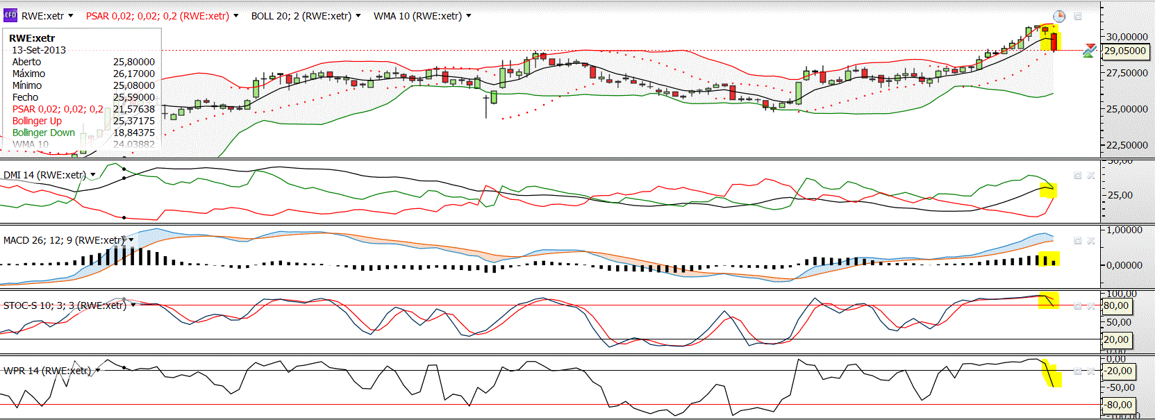 2) Similitude com situações/comportamentos anteriores (linhas amarelas no gráfico), estando os indicadores técnicos oscilatórios em situações similares à actual;