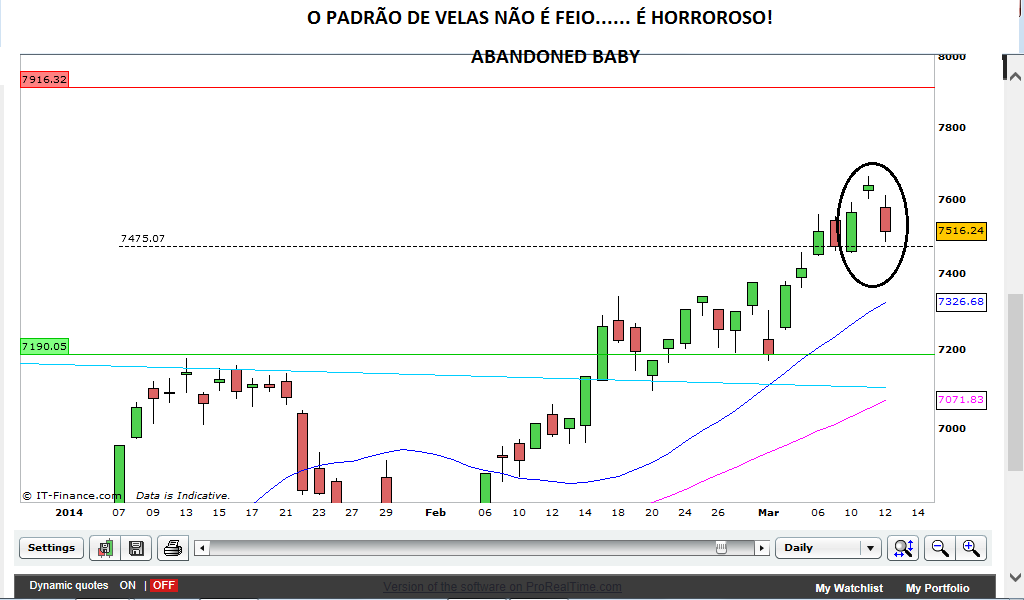 A vela do terceiro dia parece não ter GAP face ao segundo. Não será impeditivo de chamar abandoned baby? Não será antes uma bearish evening star? Em termos práticos é um padrão de inversão, estamos apenas perante uma questão de preciosismo na designação.