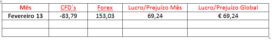 O que equivale a dizer que no mês de Fevereiro as transacções fechadas de CFD´s e Forex proporcionaram um modesto lucro de € 69,24.
