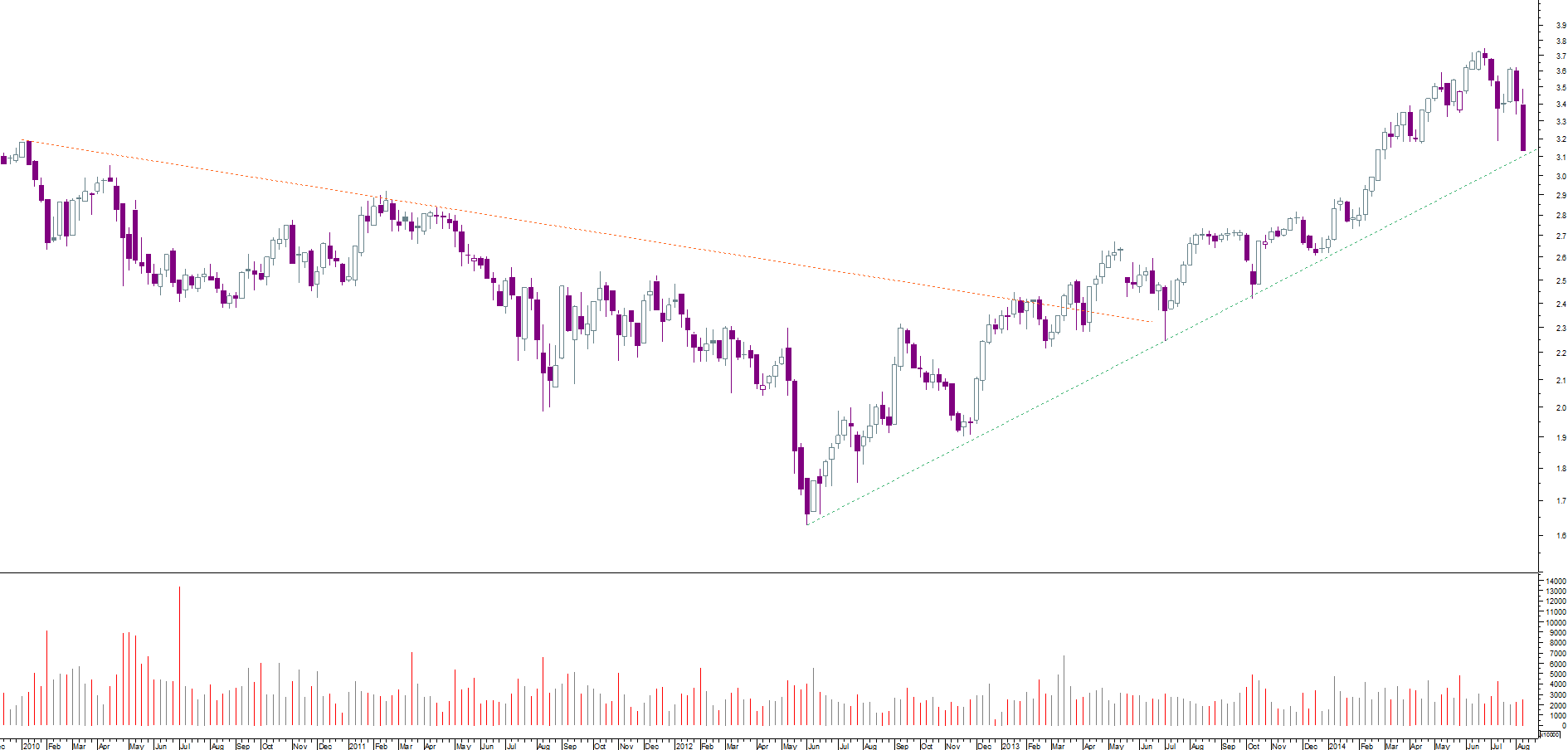 se, por um lado, desde o máximo de março, se assiste a uma toada de fundos e altos sucessivamente mais baixos, o que revela uma tendência descendente, ainda que secundária, por outro lado a cotada encontra-se momentaneamente sobre um suporte local e acabou de desenhar um padrão de velas de inversão da tendência de curto prazo (martelo)