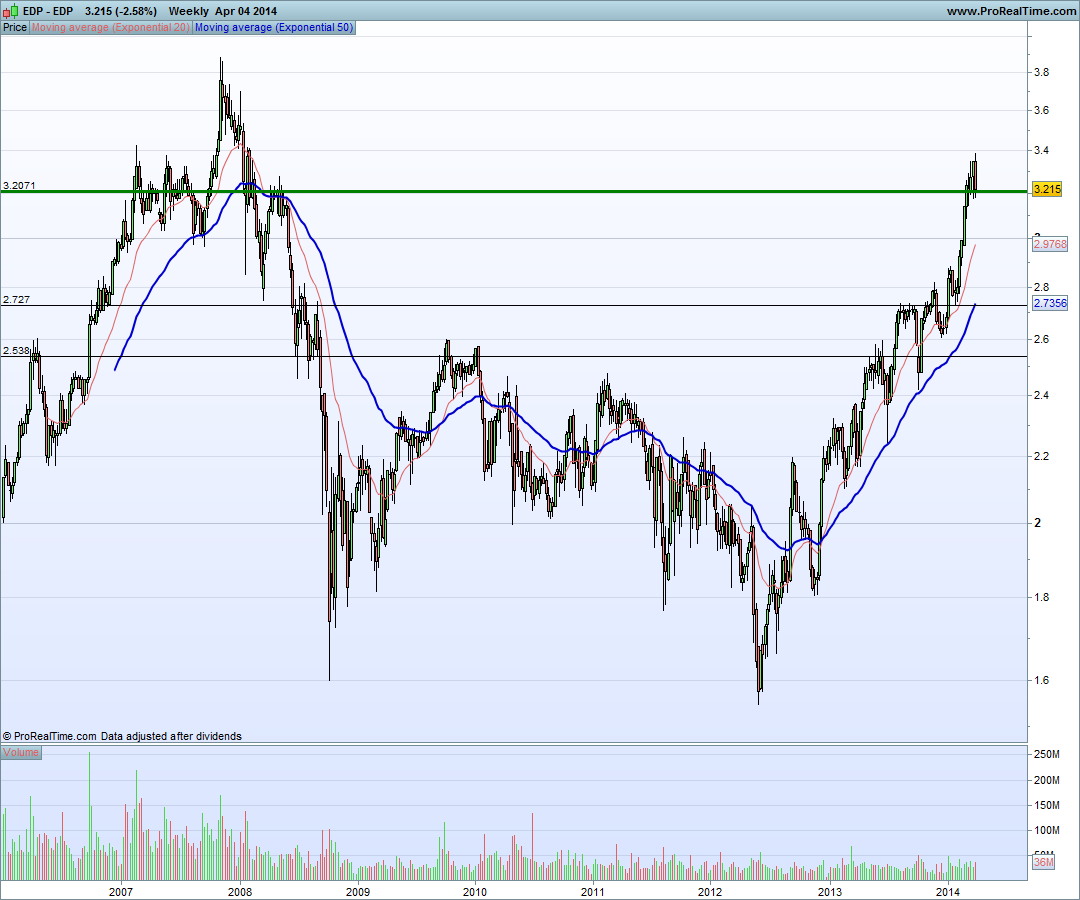 Estamos a falar de uma empresa com a faca e o queijo na mão no mercado nacional... se a troika nao lhes cortou a rentabilidade como deveria já ninguém lha corta... argumentos menos subjectivos tem bom aspecto tecnicamente e ... negoceia a desconto face ao setor em termos de forward p/e para 2015 e 2014... quanto ás securitizações parece haver quem queira por aí comprar défice tarifário o que ajuda a cortar o elevado endividamento desta empresa.. a edp r parece tb ja ter tido piores dias, excepto para quem foi em cantigas e se escaldou no IPO..... logo esta empresa pode perfeitamente ainda subir para valores da ordem dos 3.50 a 3.70, a ter que escolher melhor aposta claramente que a Portugal Telecom... Plano estratégico2014 -2017 dia 14 de Maio, podera ser esse o factor que fará a cotação disparar para valores proximos dos 3.70 caso a gestão seja capaz de convencer o mercado.....