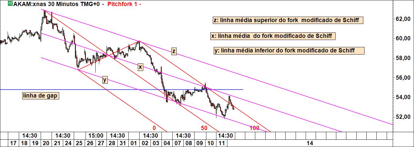 note-se também que, tendo o preço quebrado a linha multipivot azul (horizontal), a queda estancou precisamente na median line do fork descendente e na action line
