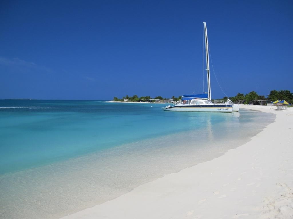 Apesar do calor exterior superior a 30º a areia é fria e branca como a neve(!), um paraíso que mantém águas de temperaturas 26º/30º transparentes, com os tons mais variados de verde e azul brilhantes caraterísticos das Caraíbas, cheias de vida dos mais variados peixes e corais.