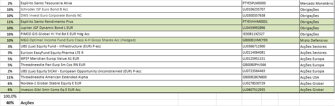 Digam da vossa justiça amigos, estou aberto às vossas sugestões de forma a optimizar o investimento. A verde estão os fundos que considerei pertinente replicar e/ou para os quais não considerei concorrentes à altura.