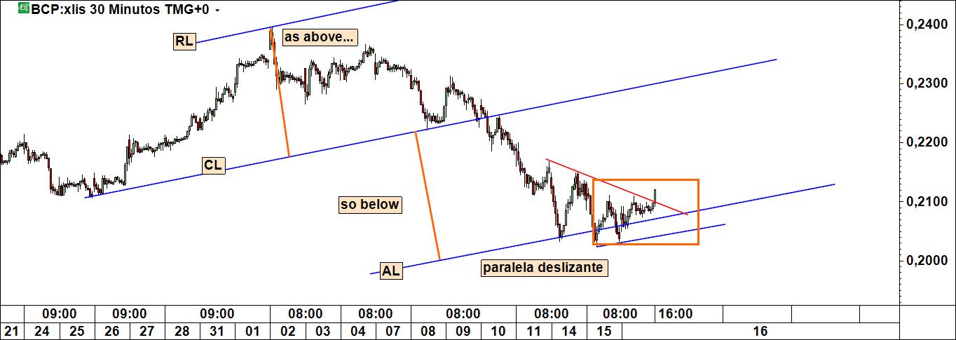 bcp 30 m: quem esteve atento à janela de oportunidade poderá ter comprado e, dada a proximidade de uma linha de resistência (cl), deverá alterar a stoploss (no mínimo b/e) e fazer o trailing da stop profit até ao target que tiver sido escolhido