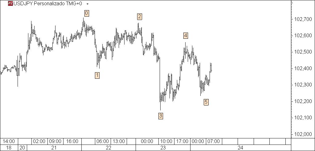 aliás, se o pivot 5 se formar acima do pivot 4 (neste caso de contagem top-down), isso é um forte sinal de próxima reaquisição da tendência de base: chama-se a isto "falha do pivot 5"