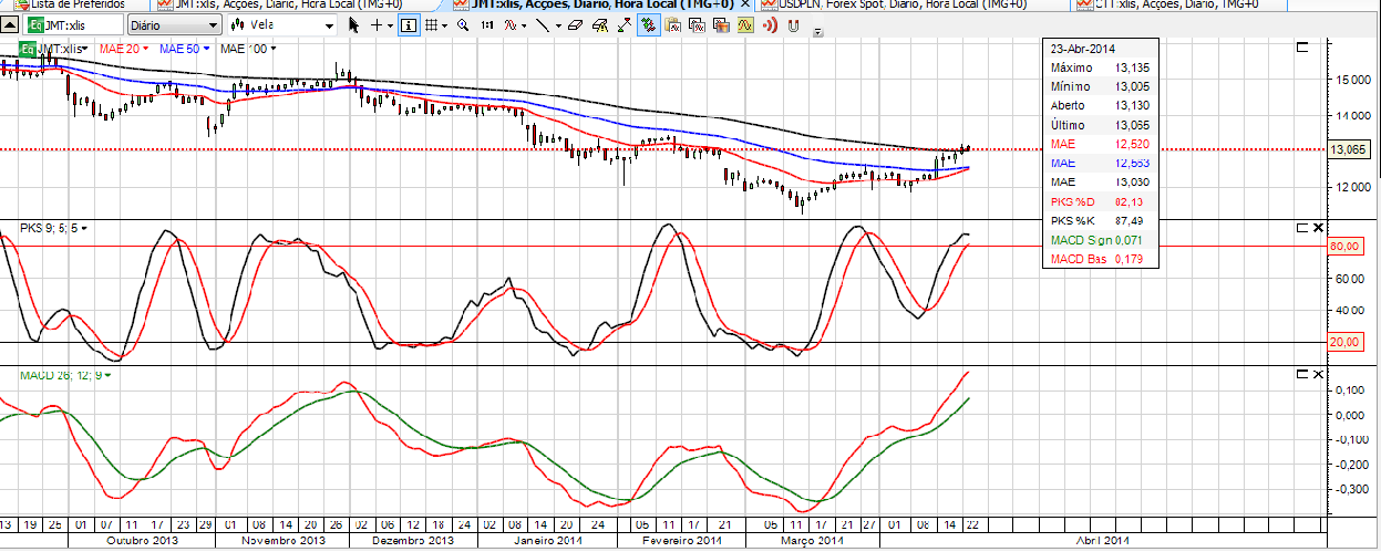 "acção-reacção" entre as velas de ontem e de hoje a coincidir com a linha média do garfo de Andrews, o primeiro "2" da contagem verde, e um dos topos do canal em traços descontinuados laranja. Relativamente aos bonecos do post do dia 9/4/2014 (p.265), a evolução da JMT.LS invalidou a contagem vermelha... Mas continua no canal descendente! A contagem verde pode acabar já nas próximas velas caso a JMT.LS va parar nos 12,50 (em pleno meio do "morobozu" do dia 14 de abril!) Caso contrário possibilidade como disse o Pickbull para visitarmos os 13,40