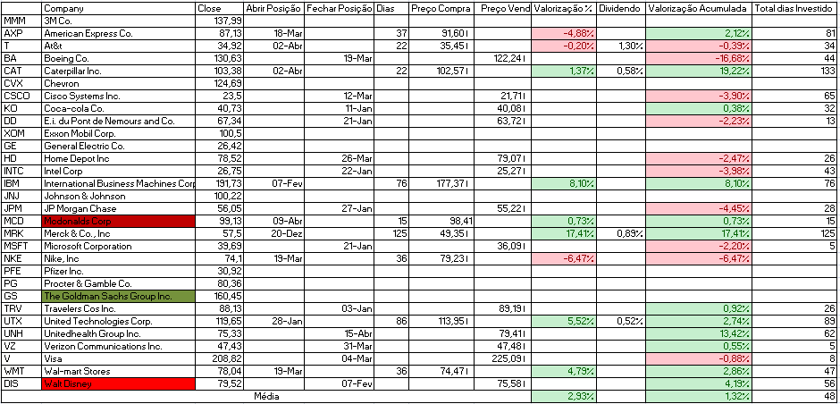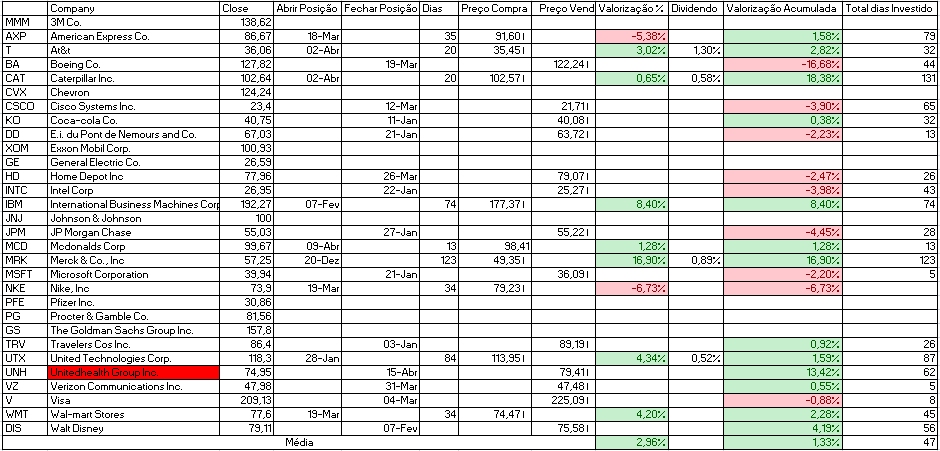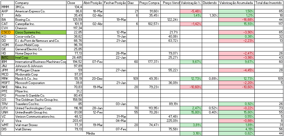 Para além disso temos a indicação de venda da Cisco Systems Inc. e compra de Johnson & Johnson e Travelers Cos Inc.