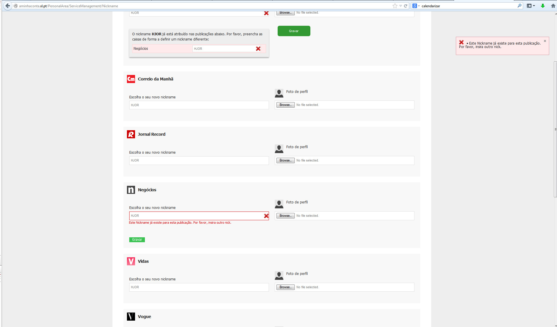 O nickname para o jornal de negócios dá erro dizendo que o nick já existe e sugere que se insira um novo.