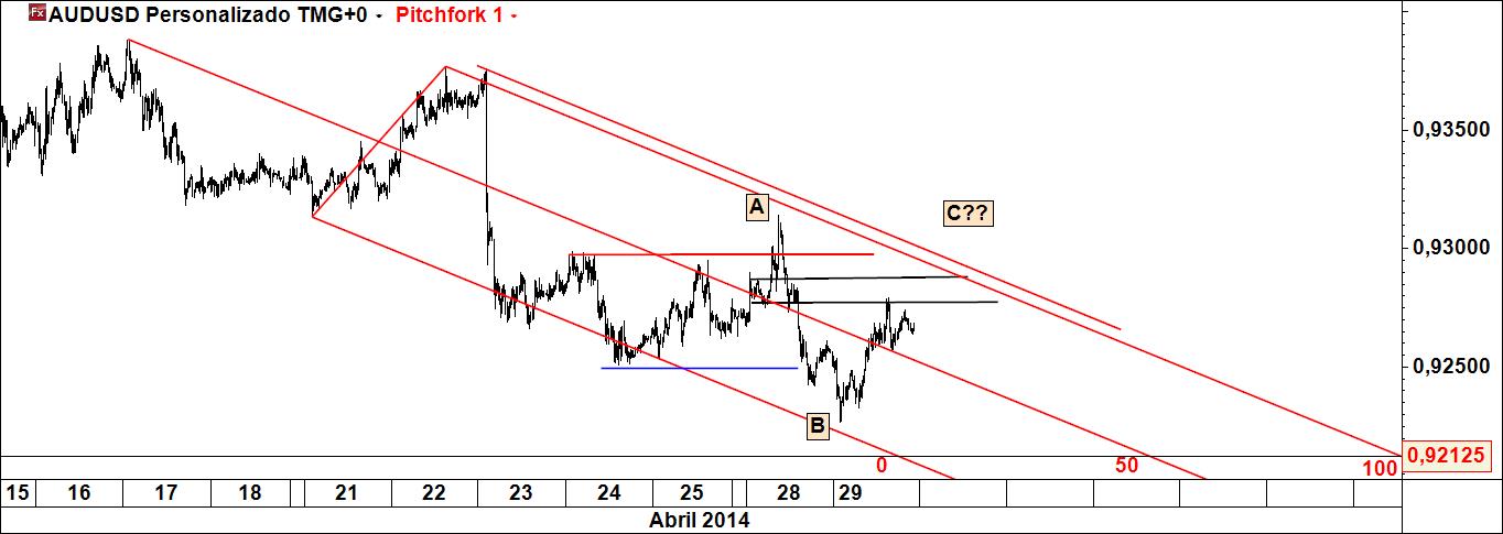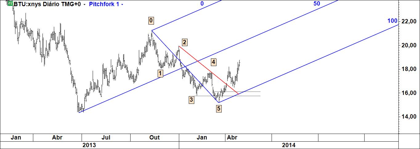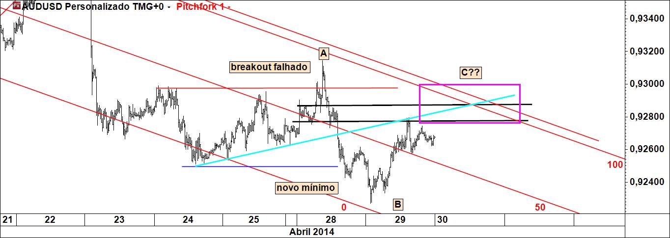 aproveitamento de eventual recuo do preço até à linha média inferior do fork azul, com stop abaixo do pivot c e target na linha de reacção