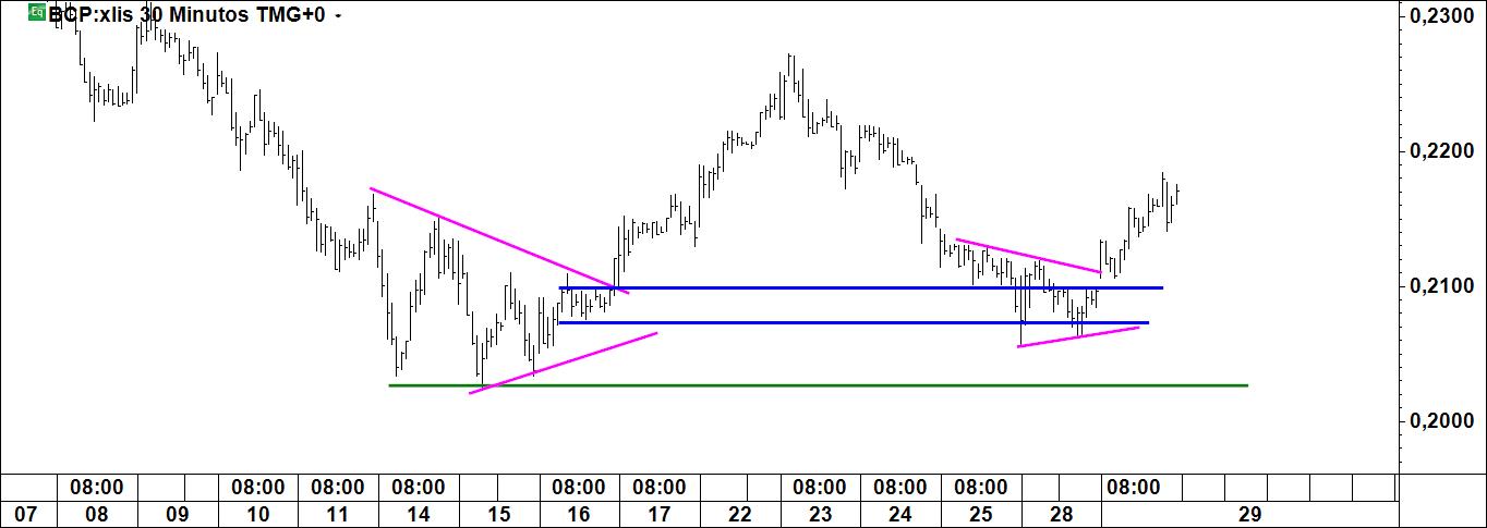 repare-se que também se pode ver aqui o que tive oportunidade de escrever a propósito do bcp 30 m: quererá o preço testar o apex do triângulo (neste caso após ter falhado o breakout)?