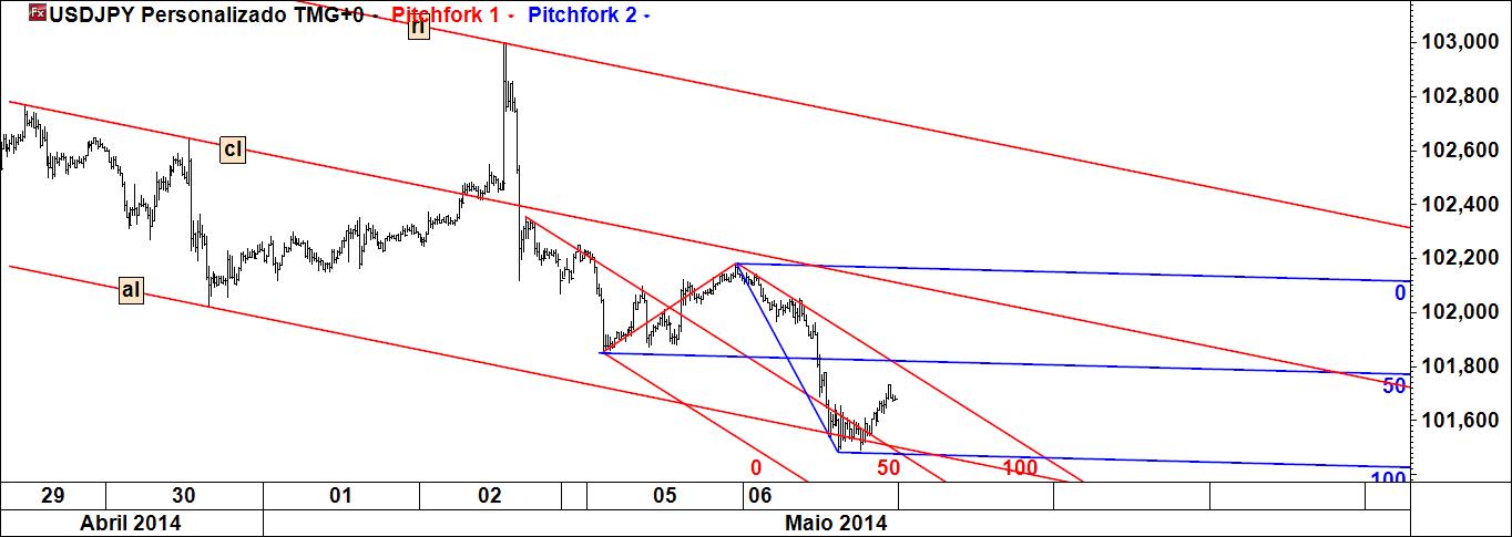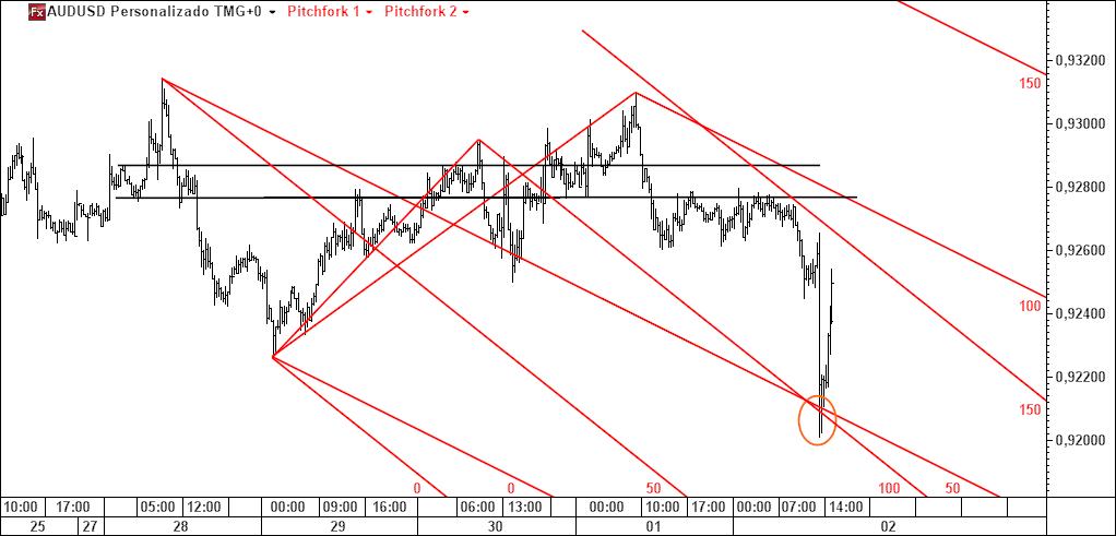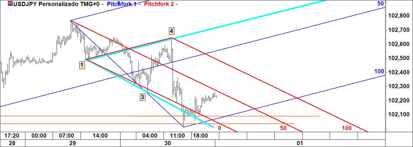 - a linha 1-4 poderá ser atingida caso se verifique movimento ascendente (actuará pois como íman do preço), sendo que Linda B. Raschke tem um método para especular com esta linha; note-se que é paralela à linha média do fork (daí paralela deslizante);