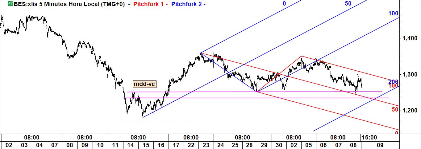 Acima coloquei um gráfico do bes a 120 m, agora vai um a 5 m. A interpretação e conclusão são as mesmas. Será que preciso mesmo de andar a saltitar entre timeframes? Pense-se no malabarismo: se não consigo fazer circular 3 bolas, faz algum sentido estar a acrescentar mais bolas? Se tenho dificuldades e ainda procuro o sucesso consistente num timeframe, faz sentido olhar e preocupar-me com outros?