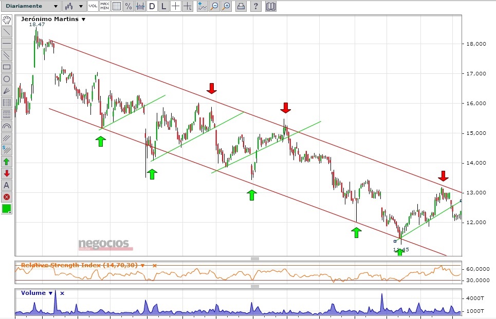 No caso da JMT, apesar de a ultima vela ser positiva, e da semana ter sido positiva, continua dentro de um canal primário descendente, sendo difícil prever a evolução de curto prazo.