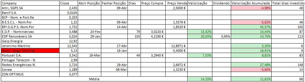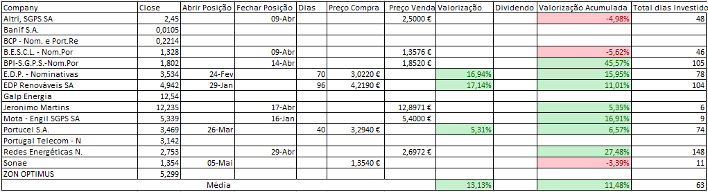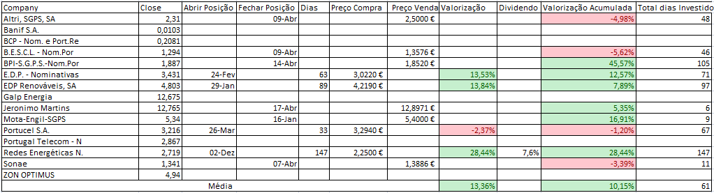 Este mês de Abril foi muito volátil, mas estes últimos dias fizeram com que tivesse terminado positivo proporcionando, julgo eu, que um novo máximo na carteira. (falta creditarem os dividendos da REN 7% do investido e que como tal não podem ser desprezados).
