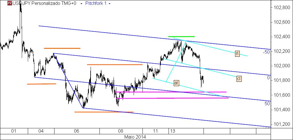 Muito interessante este comportamento do preço quando enfrentou duas linhas que, sendo descendentes (uma do fork, outra correspondente à respectiva paralela deslizante), se apresentariam como locais onde o preço, com elevada probabilidade, perderia a sua energia. Tudo o que um comprador, com posição já aberta no mercado, gosta de ver está ali. A linha de frequência, agora AL, funcionou como trampolim para o rompimento.
