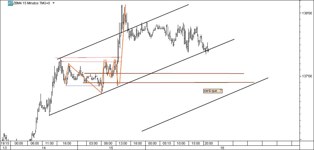 zbm4 15 m: com mais de 8 ticks de proveito na posição, stoploss no breakeven, parcial retirada de proveitos e target final pouco antes do último máximo