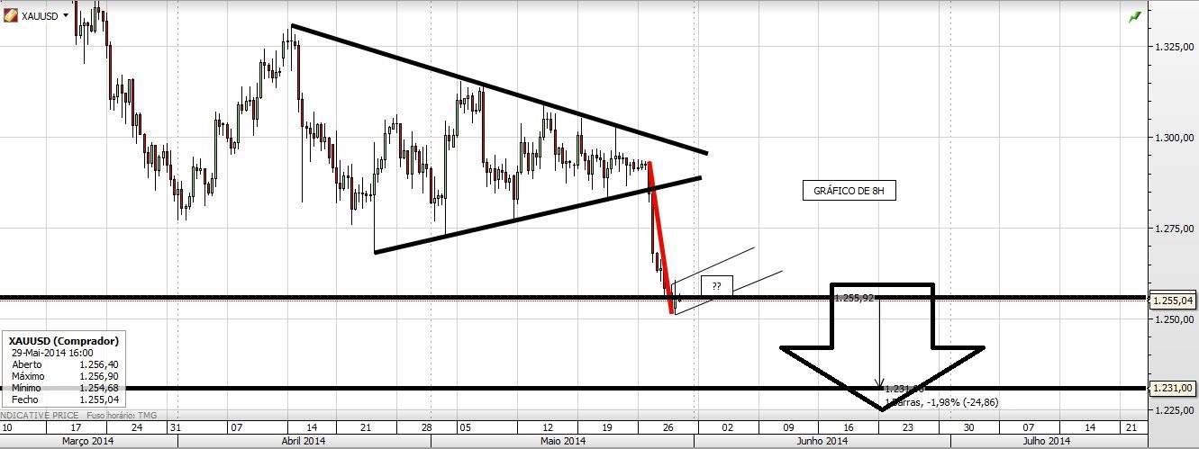 Estou curto no ouro e tenho como alvo a zona dos 1230. Porquê? (ainda não sei pôr os gráficos) para além de ter quebrado hoje o triangulo no gráfico diário, quebrou também hoje no gráfico mensal uma linha ascendente que vinha de Dezembro de 2013 e que se tinha vindo a aguentar nos últimos dias. Nesse mesmo gráfico é possível verificar que a zona dos 1230 é também ela uma das linhas do famoso Fibonacci (1231,78). Por outro lado esta mesma linha vai coincidir com uma outra linha ascendente que vem de Outubro de 2008 (gráfico mensal) e que pode muito bem representar um mínimo que venha a fazer no próximo mês de Junho. Creio por isso que este será o grande suporte do ouro no curto prazo e é por isso que esse é o meu alvo de curtíssimo prazo, sair do curto e entrar num longo para aproveitar um ressalto. Aposto ainda num triplo fundo do ouro, ou que pelo menos que vá lá perto. E porquê? Porque a Prata está a fazer um grande H&S e se a prata desce, o ouro também vai descer com mais probabilidades.