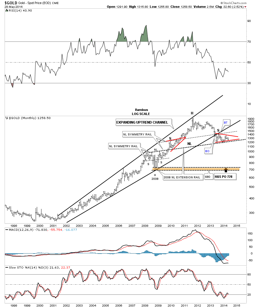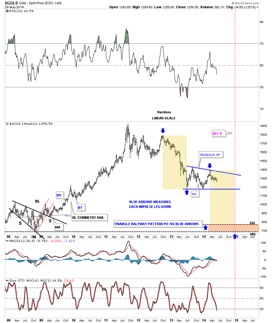 "Next I would like to show you some long term charts for gold which we’ve been following for some time now as nothing has broken the downtrend that has been in place since the September 2011 high. This first chart shows what would happen if our current blue triangle works out as a halfway pattern to the downside. Keep in mind, gold has a lot of work to do yet, but as long as it keeps making lower lows and lower highs this chart gives us something to follow.
