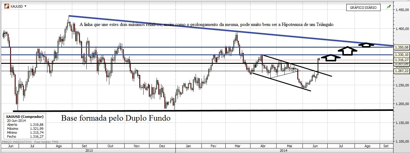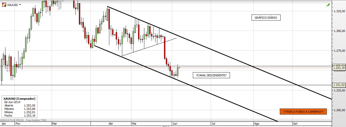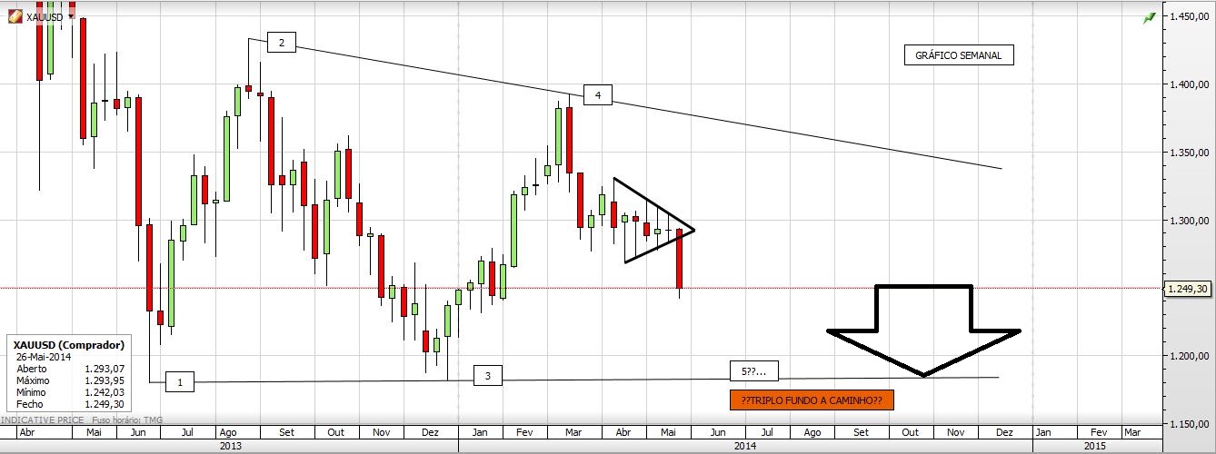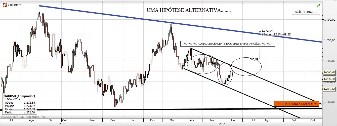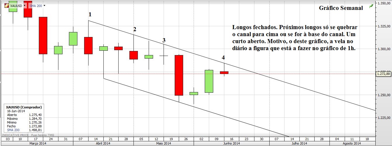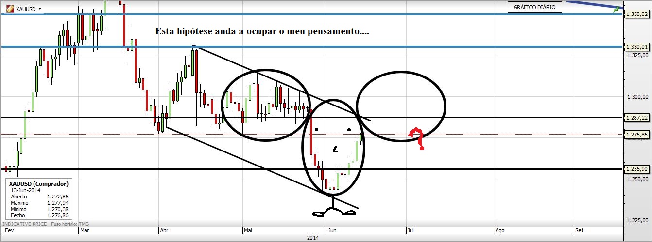 Contudo, para um cenário secundário, vendo o gráfico semanal do xauusd, só a quebra da ltd que tem 3 toques ( início 2013, meados2013 e março 2014) é que ficarei mais confiante.