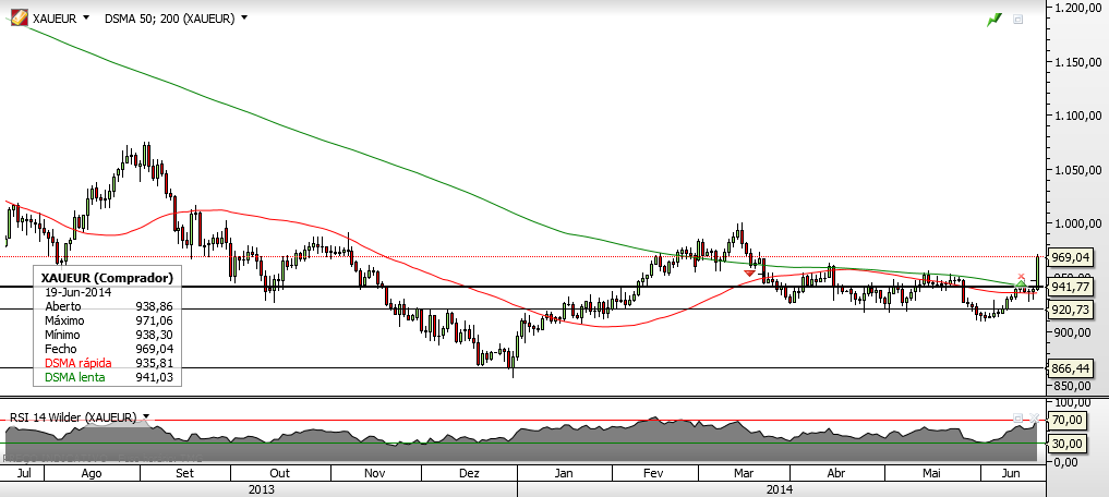 Tendo em conta, que o máximo de Março é na zona dos 1000,00 e que até lá não parece haver resistências, estou convencido que o ouro vai pelo menos testar o anterior máximo - entre os 990,00 e os 1000,00.