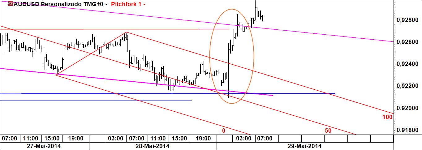 Como já tive oportunidade de referir noutras ocasiões, nem sempre as linhas fornecem protecção para colocação da stoploss, sejam elas quais forem e ainda que estejam rodeadas das mais belas probabilidades. Serve isto para fazer ver que, no contexto do eventual negócio executado naquele par cambial, o "segredo" para ainda não termos sido stopados reside no lugar onde aquela foi colocada. Agora, se a estrutura escolhida será suficiente para aguentar a corrente fase descendente do preço é algo que não se pode saber de antemão, mas uma coisa me parece evidente: não faltará muito para se saber se se aguenta ou não (é agora que os compradores terão de aparecer para protecção da zona). Se a coisa quer efectivamente subir, então é preferível que o preço volte a gostar da linha média inferior do fork e "salte para cima dela" com todo o vigor.