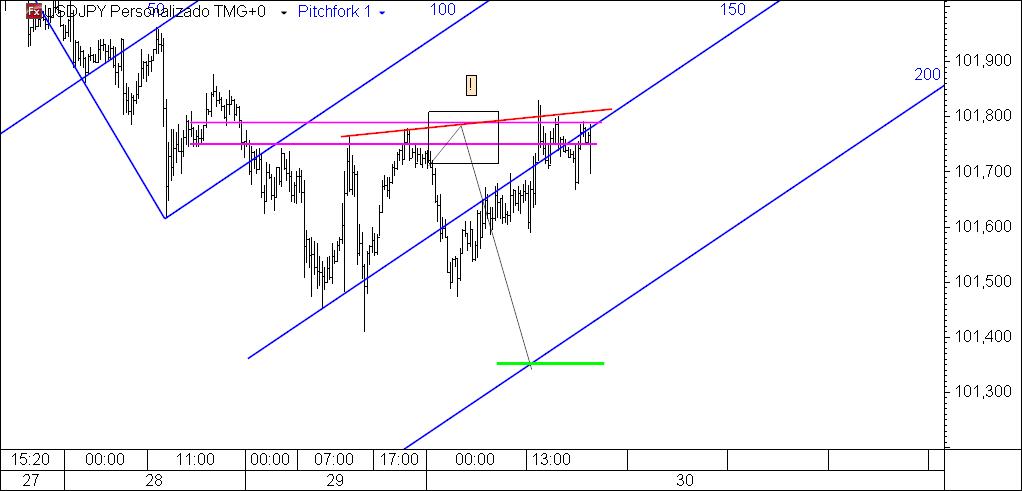 Todo o trade tem uma dimensão de preço (entrada e saída) e tempo. Cada plano deverá prever tais dimensões, entre outras coisas. No gráfico do usdjpy "queria-se" que o preço tivesse penetrado a zona assinalada no respectivo espaço temporal para encontrar a linha de resistência (a vermelho), originando a queda para o target. Verificou-se que assim não sucedeu, sendo que tal teste veio a ocorrer muito mais tarde do que o previsto no plano. Por isso, e por se aproximar o fim de semana, o plano traçado para esta oportunidade especulativa dizia-me para retirar a ordem pendente. Caso ela tivesse sido executada (com, por ex., uma venda ao mercado", o que poderia desde logo contrariar o ratio r:r 1/3, mas isso dependerá de cada um), seria importante a colocação da stoploss no b/e logo que o preço se encontrasse a cerca de metade do target, com ou sem retirada parcial de proveitos. A ter acontecido esta deslocação para b/e, a ordem terá sido executada.