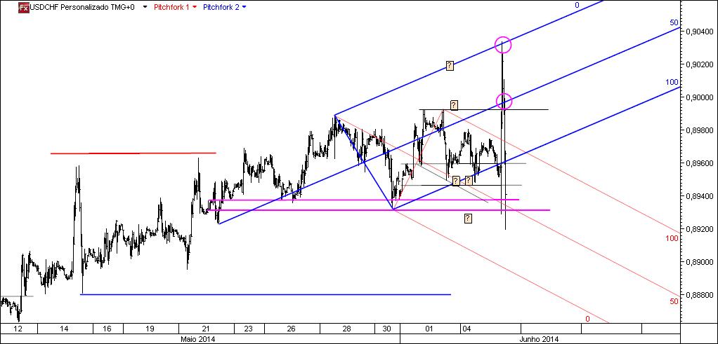 usdchf 45 m: foi atingida a stop colocada no b/e, com a intenção de ir à busca de um 3.º target com base no gráfico 120 m. Fim.
