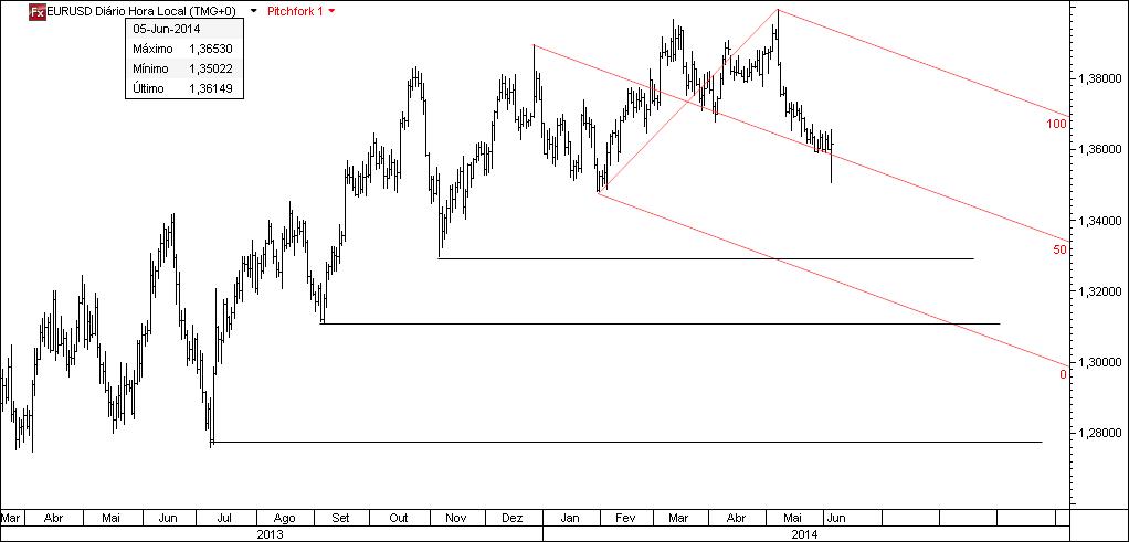 eurusd 30 m: também atingiu o segundo target, embora se esteja à espera de prosseguir a sua marcha para sul. Oportunamente, colocarei o gráfico de 30 m. Entretanto, aqui fica o gráfico diário: se o suporte ceder, podermos visitar 1.33, 1.31 e 1.28. Até lá continua outra batalha de baleias.