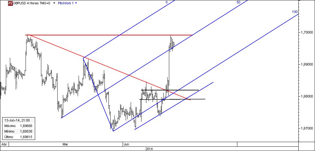 Mais uma forma de ver a perda de força gravitacional: preço deslocando-se para direita numa tentativa de escapar à linha. Continuamos sempre na mesma zona, embora com uma visão mais aproximada. As linhas assemelham-se a um pitchfork, mas não foram construídos usando a técnica de construção dos mesmos. As diferenças são bem visíveis.