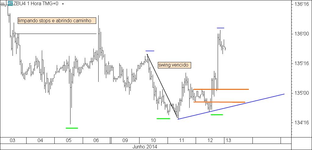 Gráfico 1: após quebra de uma linha multipivot, preço fez um higher high. Para quem se interessa por "miudezas" veja-se que as 2 barras nunca fecharam abaixo da linha quebrada. Isto leva-nos a pensar em "banhadas" ou, se se quiser, em manipulação, o que poderá constituir um bom local para colocação da stoploss.
