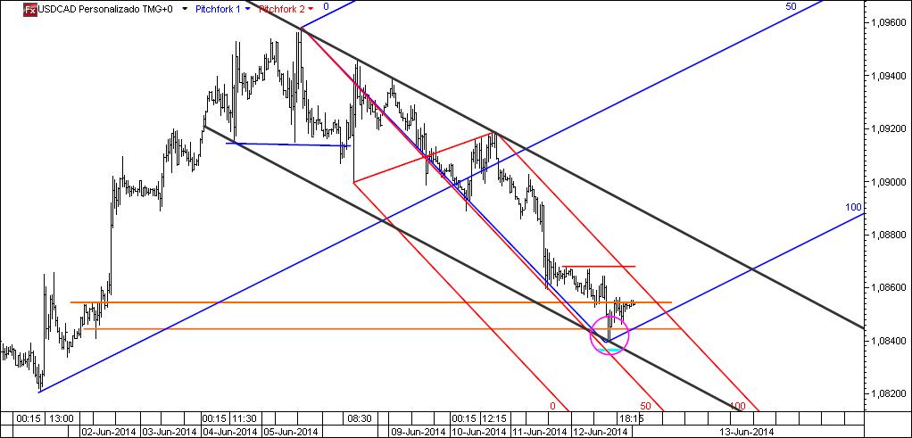 Mais uma forma de ver a perda de força gravitacional: preço deslocando-se para direita numa tentativa de escapar à linha. Continuamos sempre na mesma zona, embora com uma visão mais aproximada. As linhas assemelham-se a um pitchfork, mas não foram construídos usando a técnica de construção dos mesmos. As diferenças são bem visíveis.