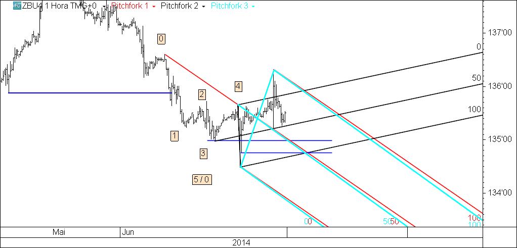 Gráficos 1, 2, 3 e 4: o mesmo mercado (30y t-bonds), o mesmo timeframe, diferentes ferramentas (várias vezes mencionadas neste tópico, pelo que seria fastidioso repetir), a mesma conclusão. Além de outros pormenores já referidos, repare-se que a linha p0-p4 serviu de barreira e agora poderá servir de suporte. Tal linha é idêntica às median lines dos forks vermelho e azul. Já se consegue ver um "maravilhoso" ponto/área de energia. Executar a oportunidade especulativa de harmonia com o mapa traçado.
