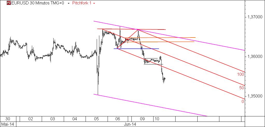 Mais uma forma de ver a perda de força gravitacional: preço deslocando-se para direita numa tentativa de escapar à linha. Continuamos sempre na mesma zona, embora com uma visão mais aproximada. As linhas assemelham-se a um pitchfork, mas não foram construídos usando a técnica de construção dos mesmos. As diferenças são bem visíveis.