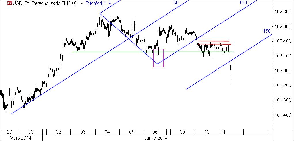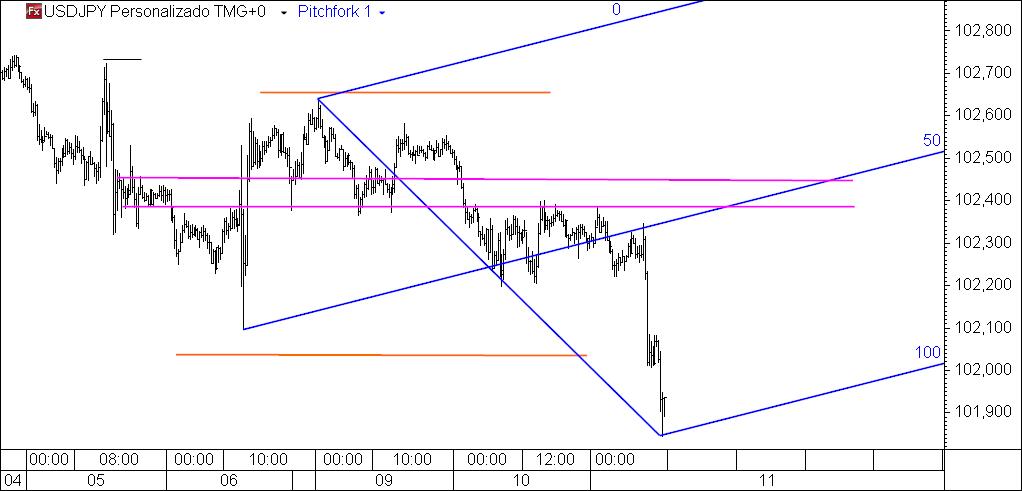 tendo o preço ultrapassado a median line inferior podemos acrescentar uma linha de aviso (equidistante) e observar o que o preço irá fazer. De momento ele encontrou uma linha multipivot que está a dar algum suporte. Para que a tendência ascendente seja readquirida parece-me ser necessário que os compradores dêem um bom sinal de que estão nessa área; caso contrário, tal linha será quebrada e abrir-se-á a porta a um eventual teste à zona dos 102,60 - 102,40. Não seria mal pensado uma compra à linha multipivot se se argumentasse com a colocação da stoploss abaixo daquilo que aparenta ser uma banhada (visível no 1.º gráfico). No 2.º gráfico está descrito aquilo que se pretende. Note-se que, caso isso suceda, poderemos usar a 2.ª banhada (inerente à quebra da linha multipivot) para "esconder" a stoploss. Como target teremos a linha média inferior do fork azul (pelo menos), que assim será testada de baixo para cima. Além de que, tendo por referência a linha de aviso, estaríamos perante aquilo que se designa por "falha hagopiana", ou seja, o preço, na sua caminhada descendente para essa linha, inverteu caminho, daí que o seu novo destino seja a linha mais próxima. E a mais próxima é a tal linha média inferior do fork azul.