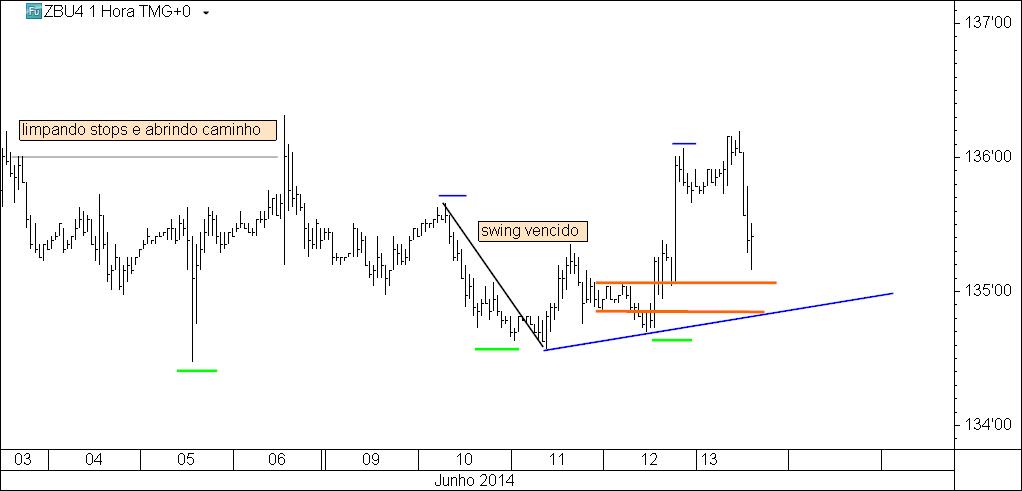 Gráfico 1: após quebra de uma linha multipivot, preço fez um higher high. Para quem se interessa por "miudezas" veja-se que as 2 barras nunca fecharam abaixo da linha quebrada. Isto leva-nos a pensar em "banhadas" ou, se se quiser, em manipulação, o que poderá constituir um bom local para colocação da stoploss.