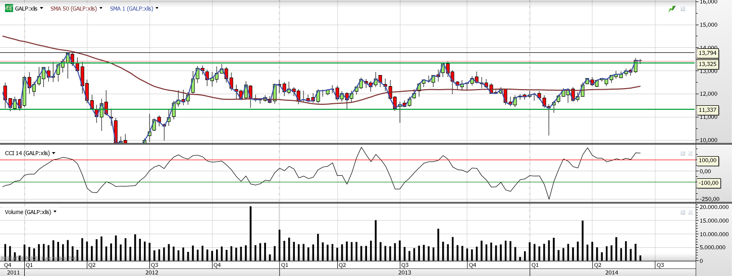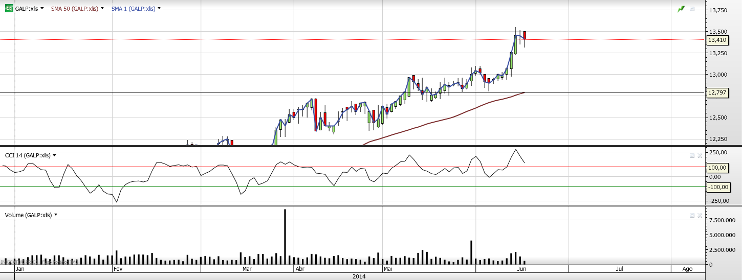 Fui rever o Discos Pedidos de 27 de Maio sobre a GALP e o Ulisses foi muito claro quanto à quebra da resistência dos 13,40. No entanto como sabem o Tiago Esteves fez no dia 12 de Junho uma análise à cotada onde colocou a possibilidade de uma queda da cotada para breve (http://surfaratendencia.blogspot.pt/201 ... anais.html). No dia seguinte em função da quebra dos 13,40 pedi um follow up ao Tiago e referiu-me que ainda existe uma resistência antiga a ter em conta, no caso a dos 13,77. Os 13,40 seriam um novo higher-higher, e a cotada tende agora para a resistência, acreditando o Tiago que se vá ficar pelo caminho pois não aguentará a escalada. Não creio que as análises sejam contraditórias pois o ataque à nova resistência pode perfeitamente ser rechaçada para posteriormente, após uma queda, existir novo “ataque”.
