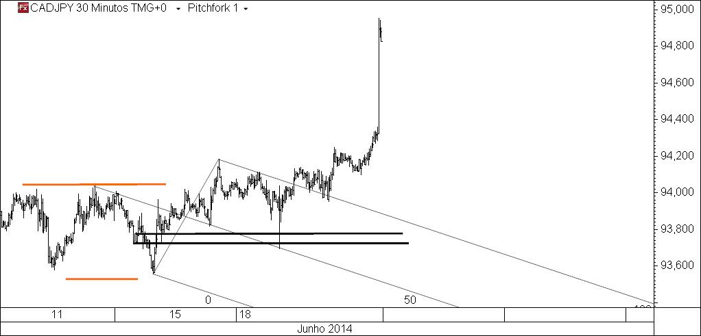 Delineei uma oportunidade especulativa no cadjpy 30 m tendo por base um padrão repetido até à saciedade. O preço não se dignou regressar à área que me interessava (como não corro atrás do preço compro em pullbacks) e a oportunidade não se concretizou. Em anterior post sugeri que a entrada poderia ter sido antecipada, sempre na observância das regras que elegi para a especulação (r:r de pelo menos 1/3, colocação de stops atrás das baleias, etc.), mas ainda não cheguei a uma conclusão segura.