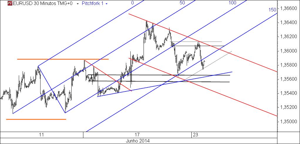 Dada a reacção ao toque na linha rosa e verificando-se a reacção do preço à median line do fork descendente, podemos dizer, com alguma segurança, que temos frequência. E se juntarmos um fork ascendente, constata-se que a linha que une os pivots B e C deste tem a mesma inclinação que a median line do fork descendente, o que nos torna ainda mais seguros de tal afirmação.