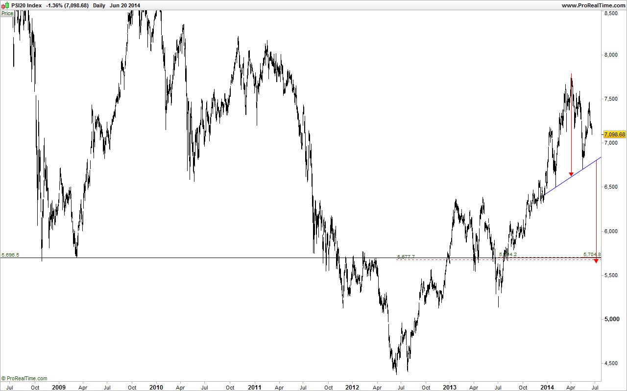 Com o BES fora de combate, o índice ameaça quebrar em baixa a MM 20.... restará a zona dos ~7150 como último bastião.