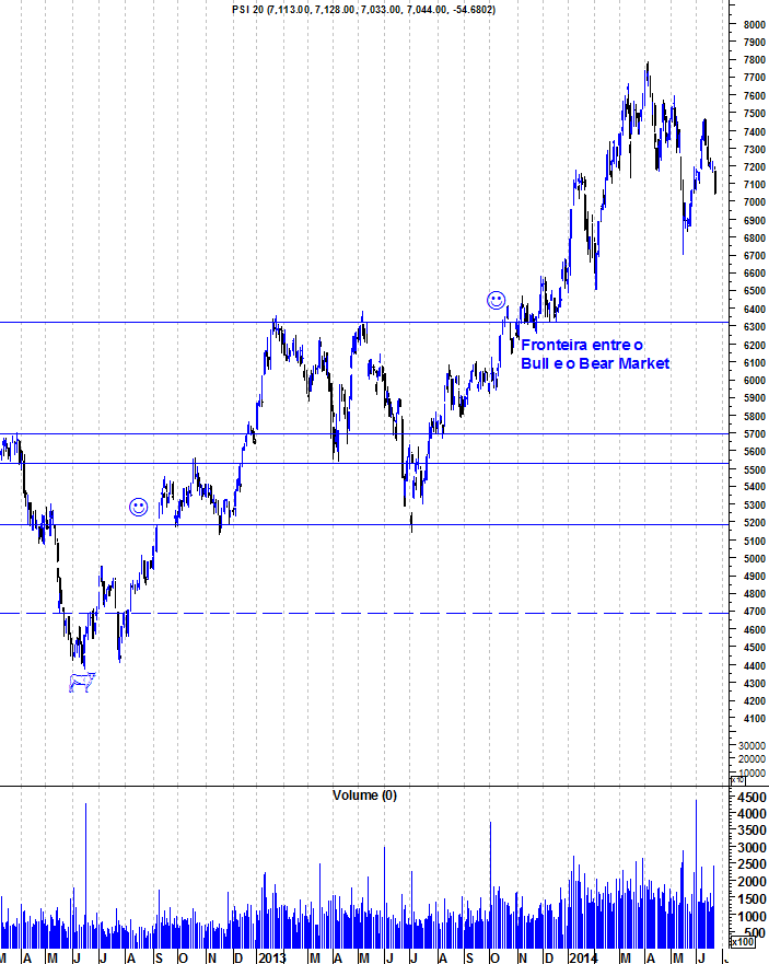 Cenário B - pessimista para o curto-médio prazo: LTA que vem desde inicio de Agosto de 2013 quebrada em baixo; sell-off generalizado até à fronteira Bull-Bear, entre os 6300-6400, com pequenas reacções em alta ao passar por cada nível de suporte. A favor deste cenário: situação de muita instabilidade e incerteza na banca; AC do BCP ainda por anunciar oficialmente; várias cotadas ainda em Bear (JMT e PT) e outra zonas de inversão de tendência (Sonae, Altri, Zon, banca...).